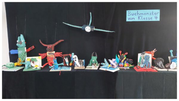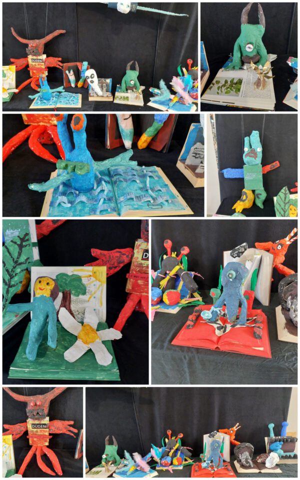 Die 3. Klasse verwandelte im Kunstunterricht Bücher in Buchmonster. Hier seht ihr/ sehen Sie die kreativen Werke der Kinder, in denen so viele tolle Ideen stecken. Wir nahmen an dem künstlerischen Wettbewerb der Landeshauptstadt Mainz und des Gutenberg-Museums teil.